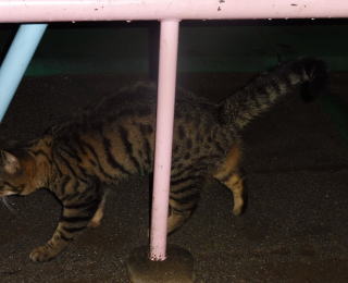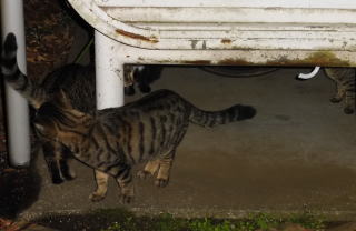 3.キジ虎三姉妹に囲まれて親父狩りにあった九郎ちゃんは自転車小屋に逃げ込んでしまいました。キジ虎Cちゃんは冬の寒い日によくクシャミをして大丈夫なのかと思っていましたが、春になってクシャミをしなくなりました。良かった。良かった。キジ虎Cちゃん一匹にも持て余して手を焼いていた九郎ちゃんですが、こうやってキジ虎三姉妹に囲まれると自ら「タヌキ汁」の鍋に身を投じる以外に選択肢がない様に感じます。まるでアメリカン・ボブテイル種とメーン・クーン種との力関係を示している様ですね。