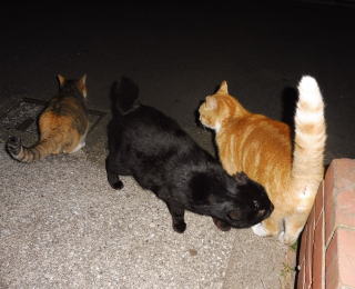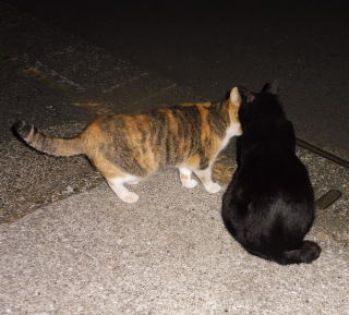 15.春になって暖かくなった午後10時頃、九郎ちゃんとキジ虎Cちゃんとの新展開がありました。三毛珍獣ちゃんは心配そうに九郎ちゃんを見つめています。