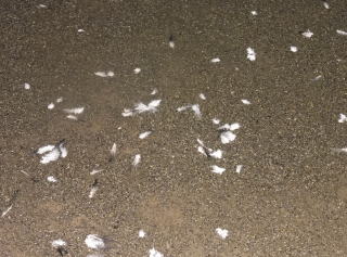 13.春になって暖かくなった途端に公園で鳩の羽が散乱する事件が発生しました。過去にも九郎ちゃんの縄張りの中で鳩のバラバラ殺人事件が発生しており、羽の他にも鳩の骨や肉など食いちぎられて画像として残すには抵抗がありました。茶珍獣ちゃんは公園で小動物を捕まえると「パパは小動物の狩りも出来ない哀れな奴」と思われているのか?小動物の死骸をパパにめぐんでくれます。しかし鳥類の狩りをした事がありません。今回は狩りに失敗したのか?鳩の羽しか残っていない為、画像として残す事にしました。九郎ちゃんは猛ダッシュして他のネコちゃんを狩りする様に鳩を襲ったのでしょうか?。