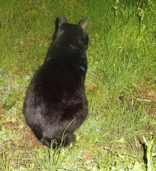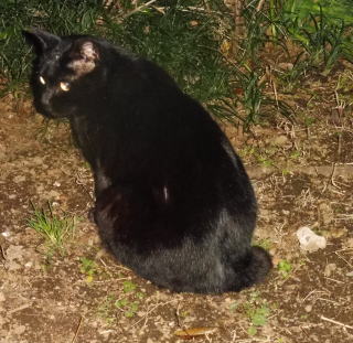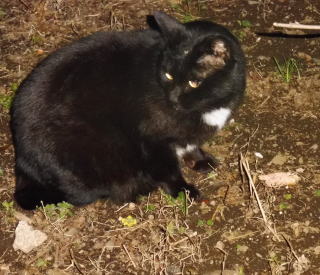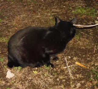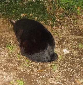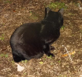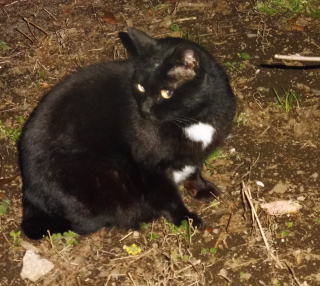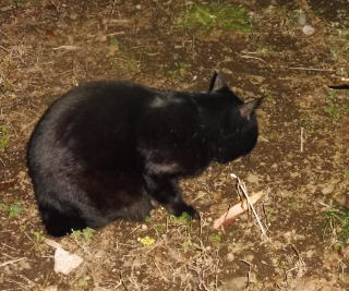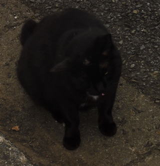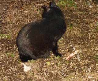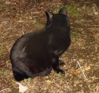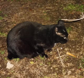 53.パパが高額な固定資産税を支払いますから空き地の土の上でくつろいでください。しかし中毛種のネコちゃんの後ろ姿は黒い毛玉の様に見えますね。