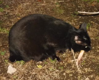 33.里山にいるはずの黒タヌキちゃんにとって、里山に川や池がなければ魚を食べる事はない様に思います。何故、里山の山頂で黒タヌキちゃんが海の魚を食べているのでしょうか?まさか海の魚を里山の山頂に運んでいた人間がいたのでしょうか?。黒タヌキちゃんの背後からキジ虎C(キャロライン王女)ちゃんが忍び寄って来ました。