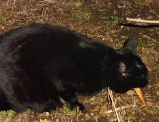 34.キジ虎C(キャロライン王女)ちゃんが一瞬、威圧すると黒タヌキちゃんは焼き鰹を差出して立ち去ってしまいました。抵抗しても焼き鰹を奪われると思ったのでしょうか?まさか群れの順位のある動物の様に分相応を弁えたのでしょうか?。