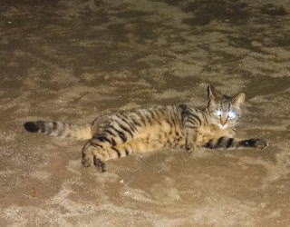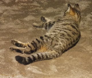 26.水着を着たグラビア・アイドルみたいにゴロンと横になったキジ虎C(キャロライン王女)ちゃん。うっかり近寄ると火傷するのでしょうか?。
