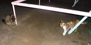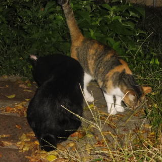 2.九郎ちゃんはクーちゃんを生きた獲物として狩りを楽しんでいますが、同じ家に通い猫をしてその時だけは仲良くしています。九郎ちゃんはネコを被っていますね。