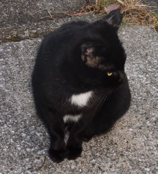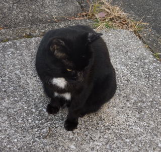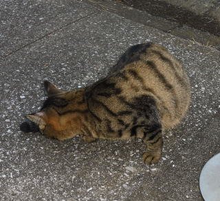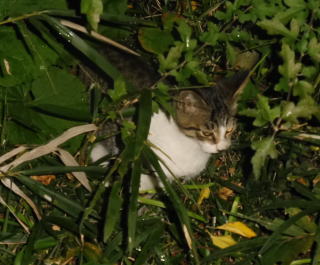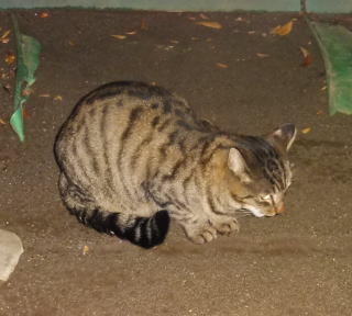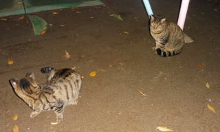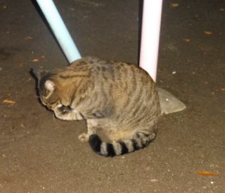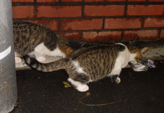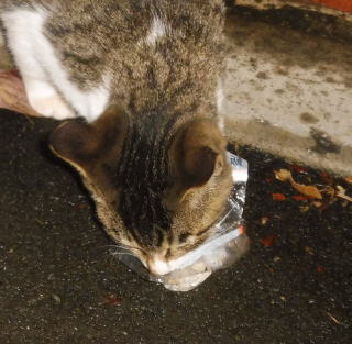 5.キジ虎白Bちゃんはデート中のパパをそっちのけでコンビニのおにぎりのビニール袋を見つけた様です。肉食獣のネコちゃんが炭水化物の米を好んで食べるとは思えませんが具でも残っていたのでしょうか?。因みににパパが子供の時にご飯にネギ入りの味噌汁をかけたネコご飯を飼い猫に与えていた記憶があるから炭水化物の米も食べるのでしょう。今、考えるとネギは猫や犬にとって猛毒です。ゾッとする話です。キジ虎白Bちゃんがおにぎりの残りを食べている?またはビニール袋をなめていると泥棒猫の白茶の子猫が興味津々に近寄って来ました。しかしまだ泥棒に目覚めていないので横取りする事はありませんでした。