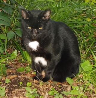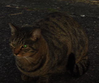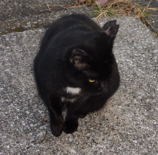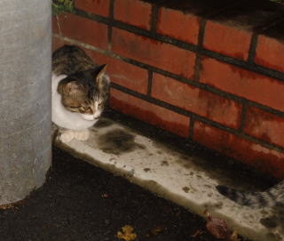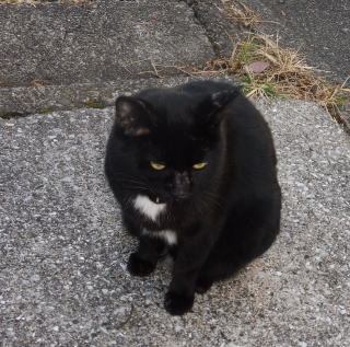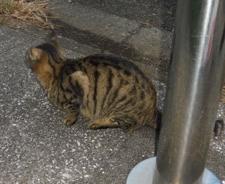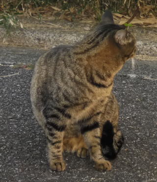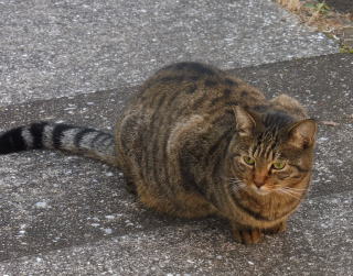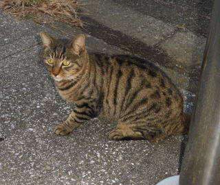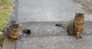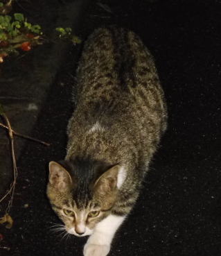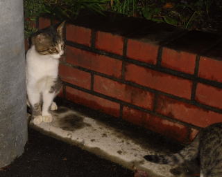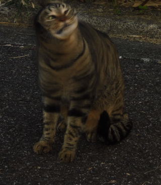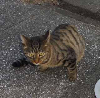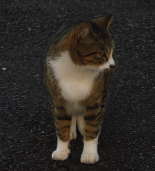 1.自宅の門の前でパパを出迎えるキジ虎白Bちゃん。