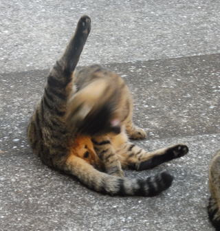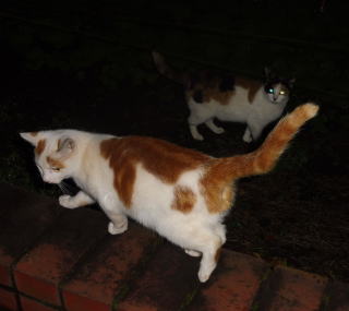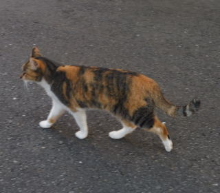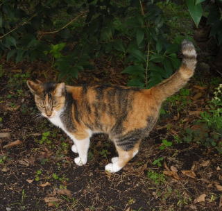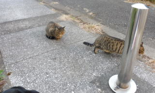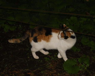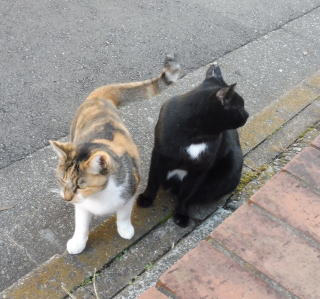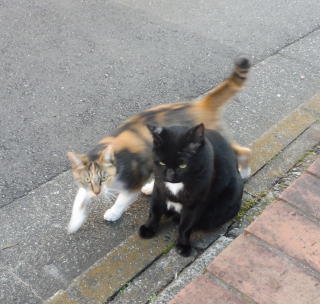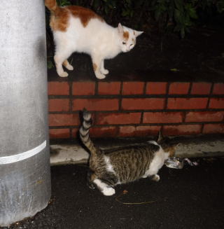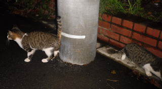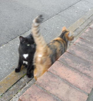 31.この画像はベスト・ショットですね。尾行して来た妻の三毛珍獣ちゃんのマーキング行動に九郎ちゃんも浮気を諦めざるをえなかったのでしょうか?。三毛珍獣ちゃんに目力を感じます。「夫の九郎ちゃんに浮気をさせない」と言う強い意志の表れです。