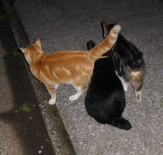 27.泥棒猫の二匹の子猫達がアン王女と群れています。九郎ちゃんの縄張りの中では茶子ちゃんや百合子ちゃんの様に順位の高い雌猫がいないので自由に和んでいます。