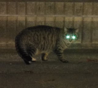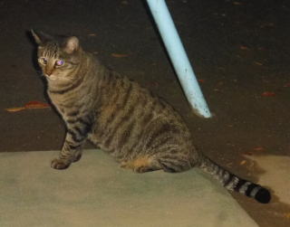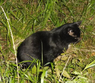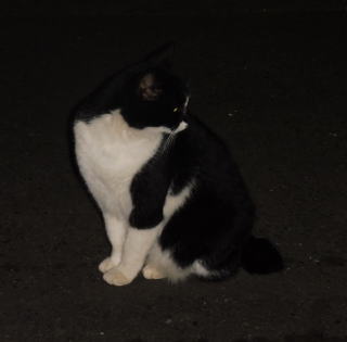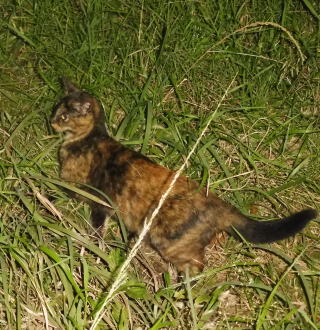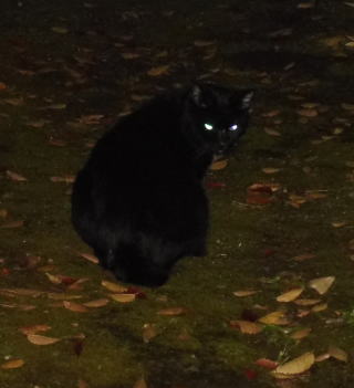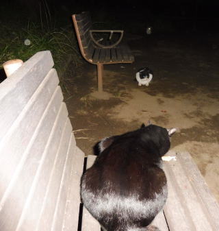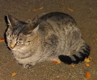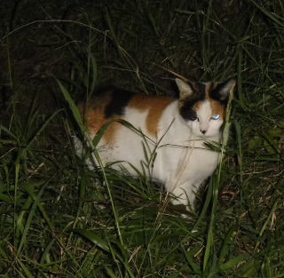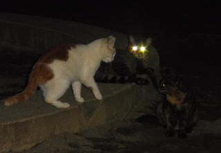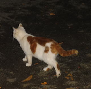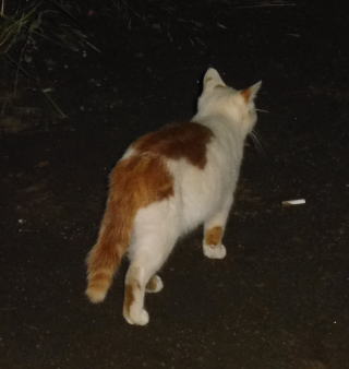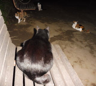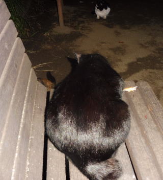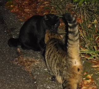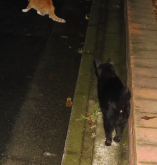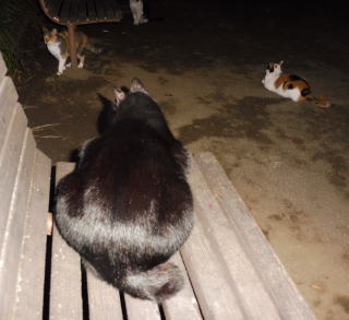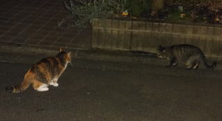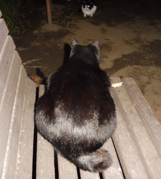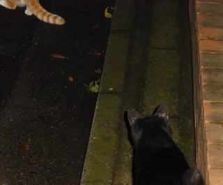 8.今夜は九郎ちゃんの縄張りの中にクーちゃんが侵入して来ました。九郎ちゃんが子猫の時から他の雄猫を追放する為に生きているサンド・バックとして狩りのトレーニングとして襲いかかっていたネコちゃんがクーちゃんであり百合子ちゃんでした。