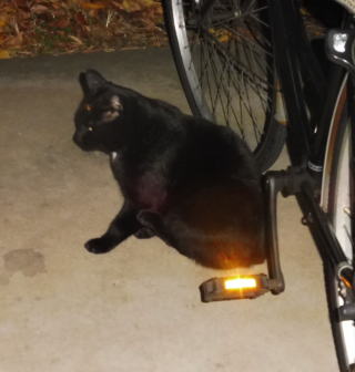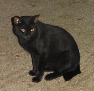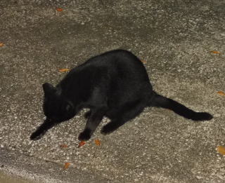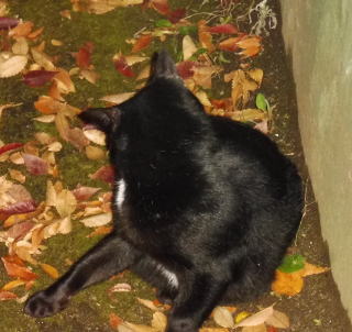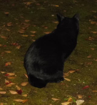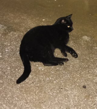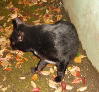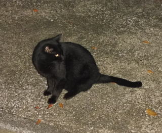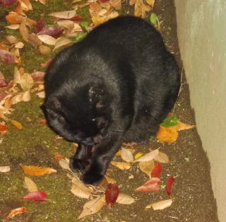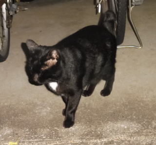E2.この画像は九郎ちゃん53の29です。この黒ポン太ちゃんも九郎ちゃんの縄張りに居候する雄猫です。九郎ちゃんは黒ポン太ちゃんを実の息子または弟子の様に保護して可愛がって来ました。しかしネコちゃんの発情期の直前の2017年1月25日の夜に事件が発生しました。九郎ちゃんは黒ポン太ちゃんをイジメる大柄な雄の黒猫を追放して自分の縄張りに隣接する駐車場に縄張りを譲ってあげたにも係わらずパパが駐車場の黒ポン太ちゃんに会いに行くとどこからともなく九郎ちゃんが現れ、普段は無口な九郎ちゃんが「ミャン。ミャン。ミャン」と怒号を発して黒ポン太ちゃんと数十mにおよぶ追っかけっこをしました。二歳児になった九郎ちゃんが発情期を迎えて女に目覚めてエロ親父になりました。今年で黒ポン太ちゃんは二歳児になり初めての発情期を迎える事になります。今まで九郎ちゃんは黒ポン太ちゃんを息子または弟子として接して来ましたが、これからは成猫としてライバル視すると言う事なのでしょうか?。黒ポン太ちゃんに九郎ちゃんの様な凶暴さはありません。今後はどうなるのでしょうか?。