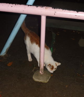 22.九郎ちゃんはベンチの下のサビ柄の子猫を覗き込んでいますね。「お嬢ちゃん。もう少し大きくなってフェロモンを出す様になったらお尻の匂いを嗅がせてくれ」とお願いをしている様にも見えます。自分の縄張りを持たない居候の雄猫は子猫を殺す習性があるのに広大な縄張りを持つ九郎ちゃんは泥棒猫の二匹の子猫まで将来の妻としようと言う魂胆なのでしょうか?。
