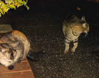 E3.この画像は珍獣ちゃん姉妹30の44です。九郎ちゃんに追放されたミカンちゃんに毛柄がソックリな雄猫(左)とファニナル(右)はまるで隠居生活に入ったかの様に他家に通い猫をして余生を過ごしています。居候をしている雄猫はこうやって雌猫と同様に群れています。自分の縄張りを持たず居候をしている場合は群れている以上、順位が発生しているのかもしれません。この二匹は九郎ちゃんや獅子丸から失地回復する事は可能なのでしょうか?。