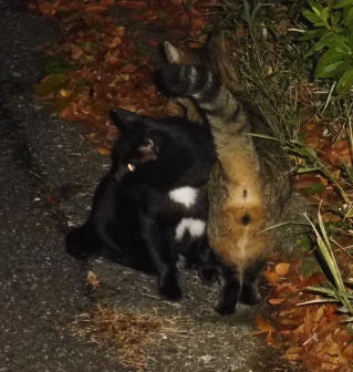 F1.この画像は九郎ちゃん14の47です。九郎ちゃんは広大な縄張りの中で雌猫の群れを相手にする訳ではなく個別に雌猫とイチャイチャしています。ここがライオンのプライド(群れ)と異なる点です。本来なら黒珍獣ちゃんとイチャイチャしようとしていたのに黒珍獣ちゃんと茶珍獣ちゃんが姉妹で群れていた為、こう言う画像になったのでしょう。群れる習慣のない雄猫の九郎ちゃんは一夫多妻制に基き他の雄猫が侵入しない広大な縄張りの中で個別に夫婦関係を築こうとしていたのでしょう。茶珍獣ちゃんは九郎ちゃんの首に尾を乗せていますね。この仕草は人間の女性のどの仕草に対応するのでしょうか?。