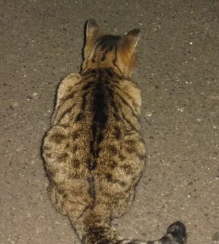 30.九郎ちゃんは常に草むらに隠れて獲物となる他のネコちゃんを見つけると長い手足から生ずる長い歩幅と鶏の太ももの様な後ろ足で遠くまで猛ダッシュする事ができます。普通のリビア山猫系の華奢な家猫はその身体能力の差から九郎ちゃんになすすべもなく狩られてしまうのでしょう。パパも50mの先に九郎ちゃんがいると目視するとわずかの間にパパの足元をマーキング行動をしています。九郎ちゃんは瞬間移動した訳ではなく猛ダッシュして来たのです。普段は食べ過ぎでタヌキの置物体型になってヨチヨチ歩いていても長い手足と鶏の太ももの様な筋肉で猛ダッシュできるから広大な縄張りを維持できるのです。