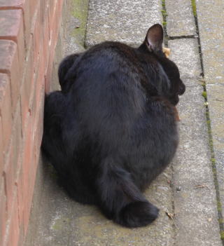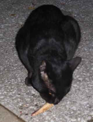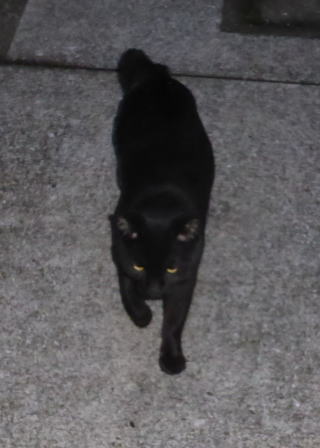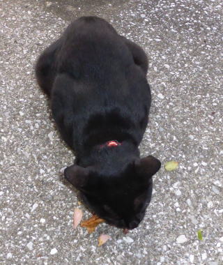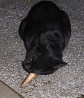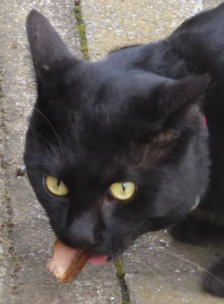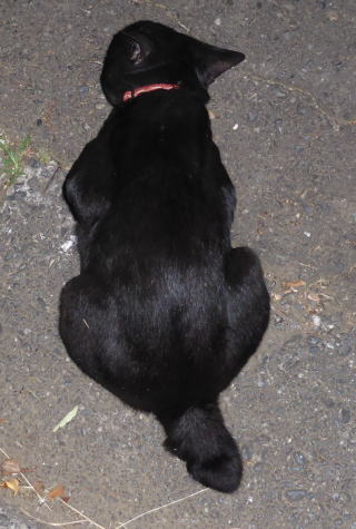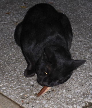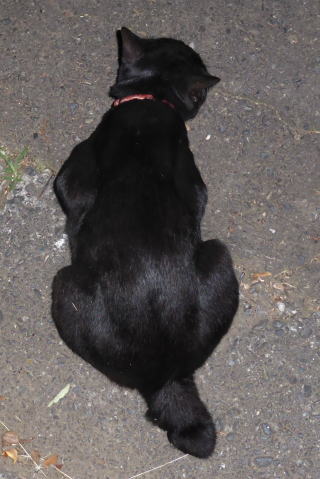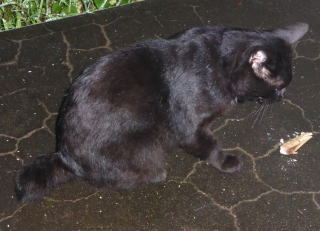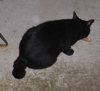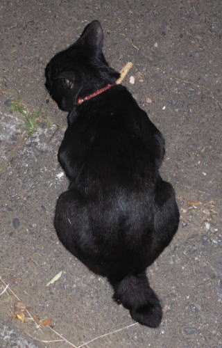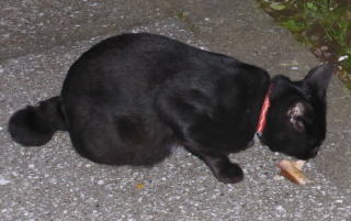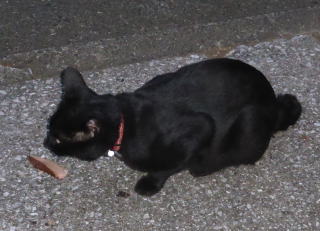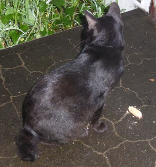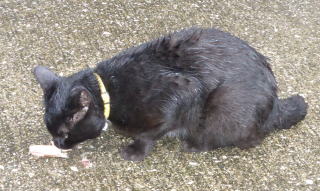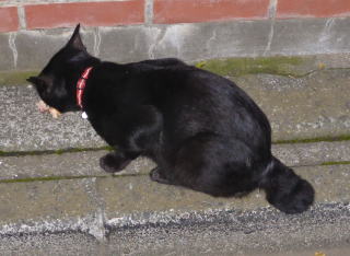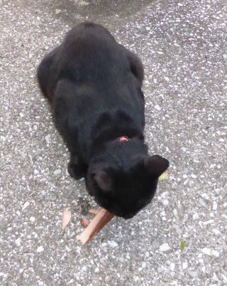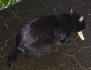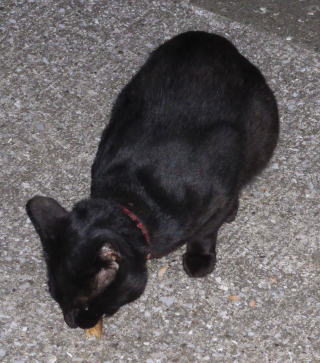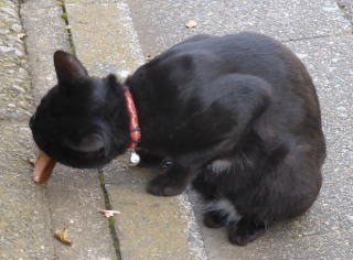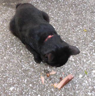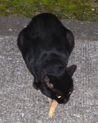 42.身の危険を感じて逃げるのか?と思ったら裏を向いて焼き鰹を食べている。九郎ちゃんは豪気な猫だ。