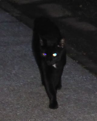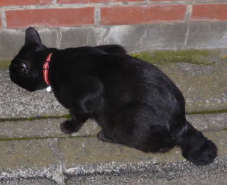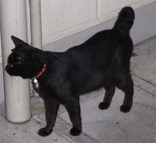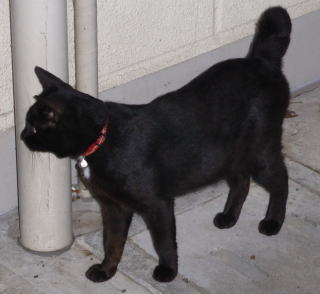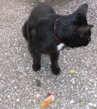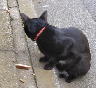 36.どこまでも一緒に歩いてくるかと思ったら駐車場にいた雄猫とにらみ合いになってしまった。この子は悪ガキだから他の雄がいると喧嘩して雌がいるとイジメてしまうのです。