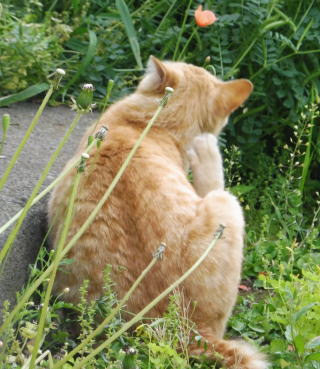 42.九郎ちゃんが背中の毛繕いをしていますが、左目と左耳の間の冬毛が抜けて、ハゲている様にも見えます。