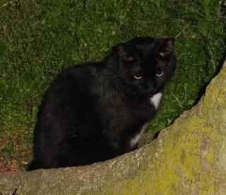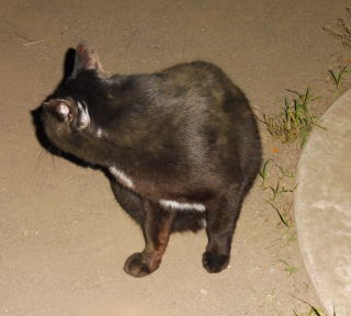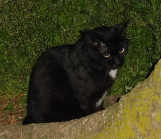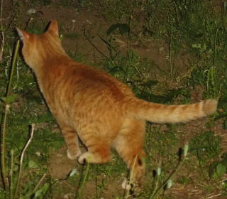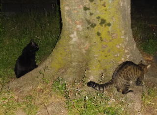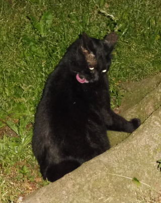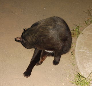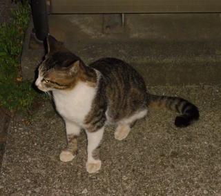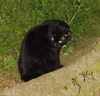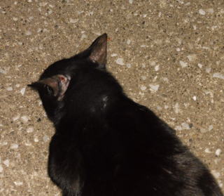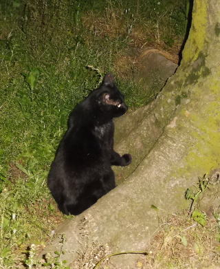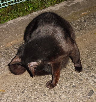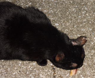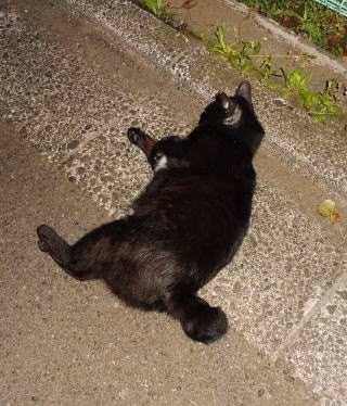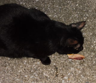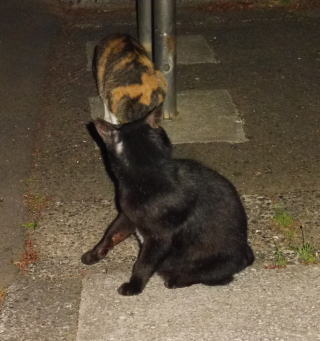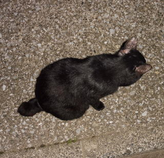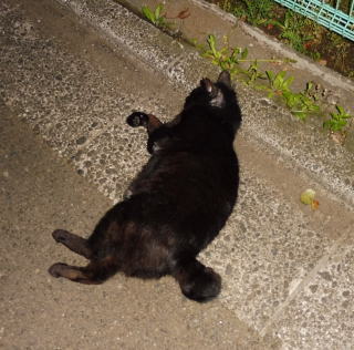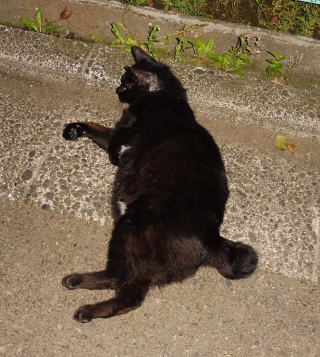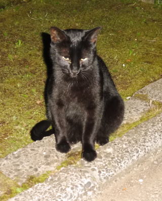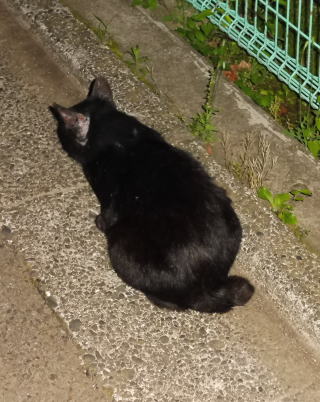 45.九郎ちゃんと共に黒ポン太ちゃんを追放した大柄な雄の黒猫がパパを出迎えていました。パパは九郎ちゃんの後継者として養い育てた黒ポン太ちゃんの事を思うと言葉になりません。大柄な雄の黒猫も茶毛化していましたが、九郎ちゃんほどハッキリしていません。明確に冬毛から夏毛に生え変わるのは九郎ちゃんだけなのでしょうか?。