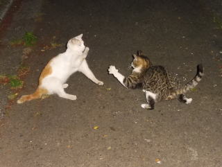 27.キジ虎白Bちゃんのストーカーをした泥棒猫の白茶の息子にキジ虎白Aちゃんが「あの子に近寄らないで」と爪出しネコ・パンチをしました。泥棒猫の白茶の息子もビックリして応戦しています。