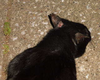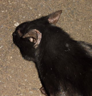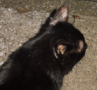 36.左耳の後ろの毛が大量に抜けて2~3cmハゲている箇所にはまだ夏毛の産毛が生えていません。耳の裏が痒いのか?爪で掻いて出血しています。