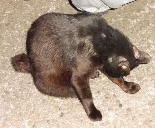 25.一時的に狂暴的禿狸の九郎ちゃんは上半身が黒毛、下半身が茶毛、胸と腹の白毛と三毛猫の雄に擬態しています。更にハゲ頭になった貴重なネコちゃんです。売る気はないが数百万~数千万円くらいの価値が付いても良いのではないでしょうか?。しかし来月になると元の黒タヌキに戻ってしまいますが…。