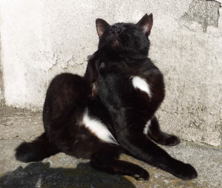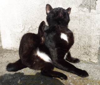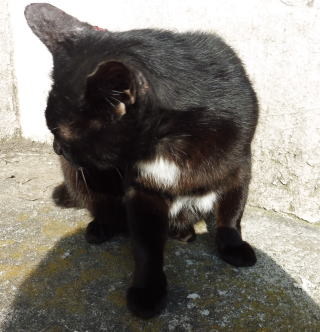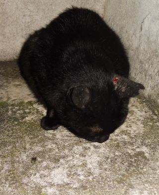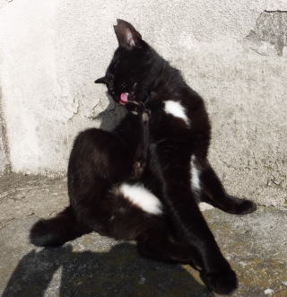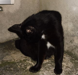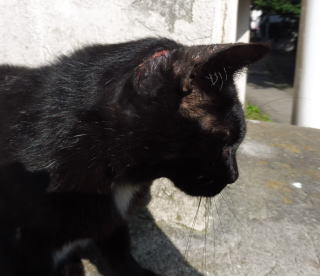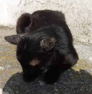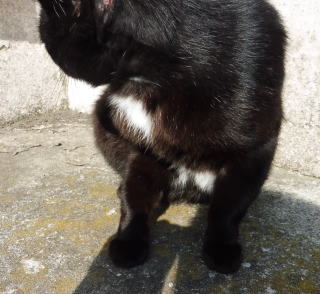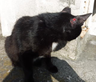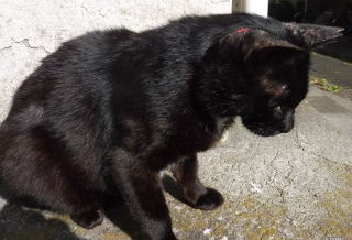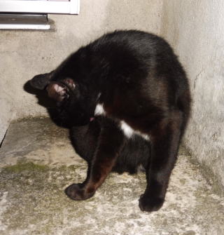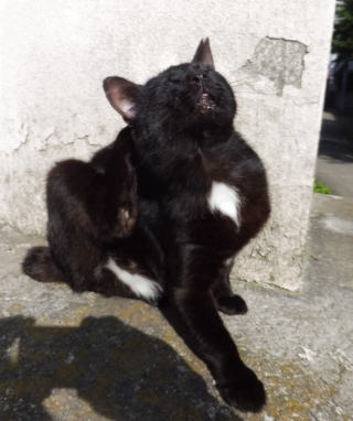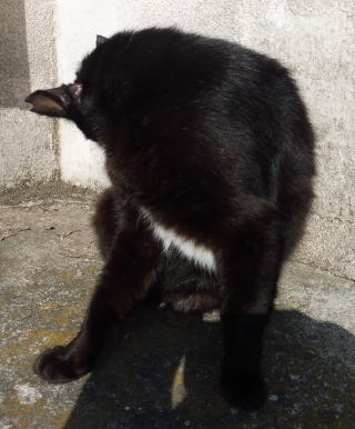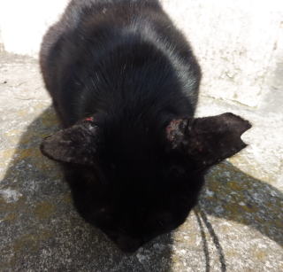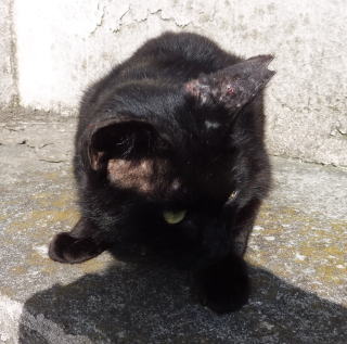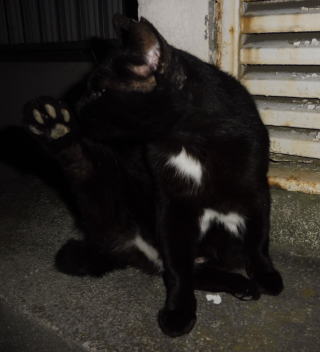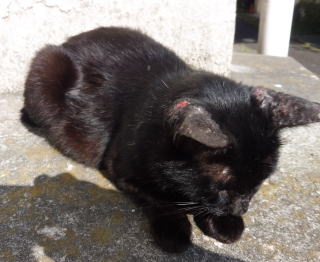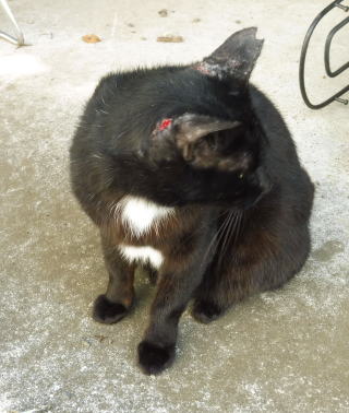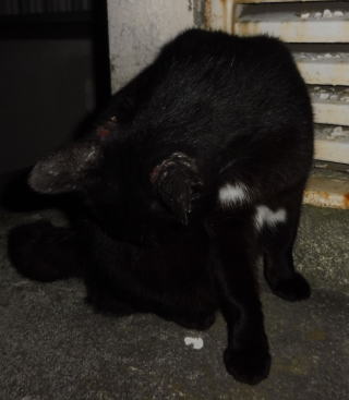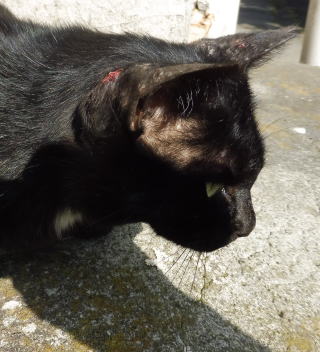 13.25度以上の夏日や30度以上の真夏日が続いています。耳の後ろを足でかいて痛みで正気を保とうとしているのでしょうか?。かき過ぎで出血しています。