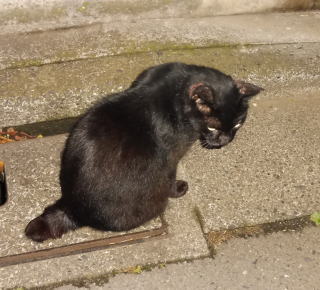 27.(仮名)黒猫Dちゃんは多くの通行人から愛され御飯をもらっていますが、パパ以外の人間は怖いのでしょうね。パパ以外の人間が2m以内に近寄ると逃げてしまいます。