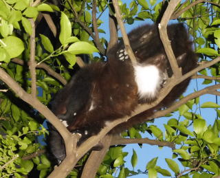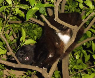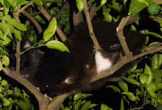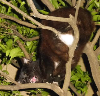 17.数日後、まだ夕方になる前から木に登りお休みモードになった黒猫ちゃん。一日の大半を木の上で寝ているのでしょうか?。