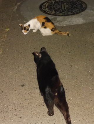 41.烈ちゃんは人間が不慣れです。飼い猫で巧みに人間を利用する九郎ちゃんに対して友達の様なフリをして一緒に人間に近寄ります。烈ちゃんもパパには30cmの距離まで接近できますが、普通の人間には2m以上の距離が必要です。まだ烈ちゃん一匹で人間に近寄る事は出来なくても九郎ちゃんと一緒なら近寄れます。