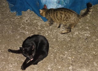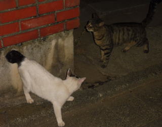 7.狂暴的禿狸が負けネコの様に顔を背けています。縄張りの主の新旧交代に発展するのでしょうか?。