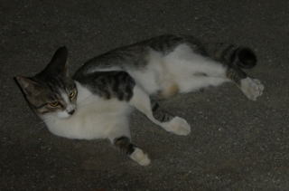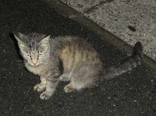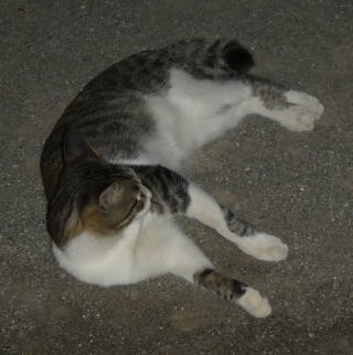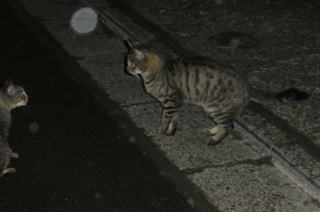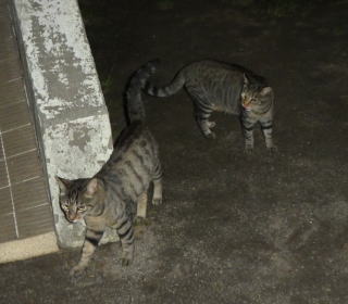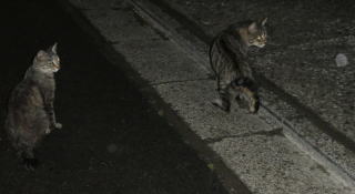 43.逃げる九郎ちゃんを見送る烈ちゃん。移動する野良猫の烈ちゃんですがパパの30cm横で平然と座っていられるのは数件の通い猫をしている民家があるからなのでしょうか?。野良の割に人馴れをしています。