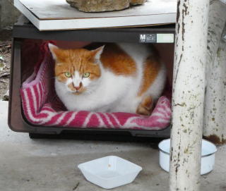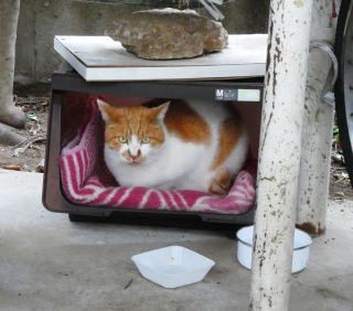 49.化粧箱を再利用したネコ小屋に住んでいるとろい茶白の雄猫。いつからネコ小屋をつくってもらったのですか?。