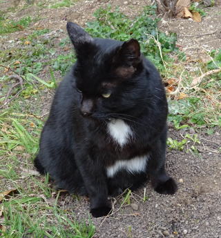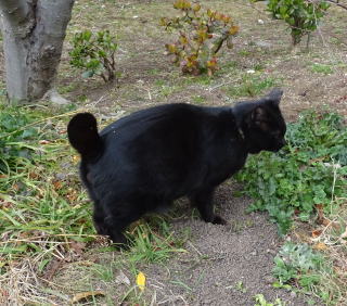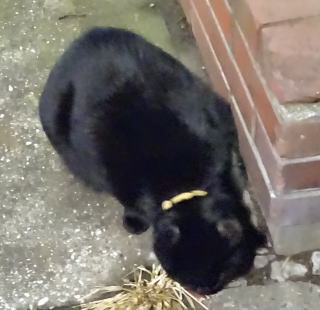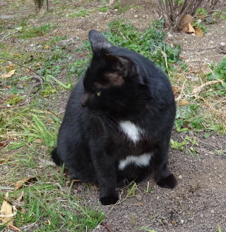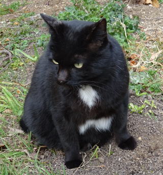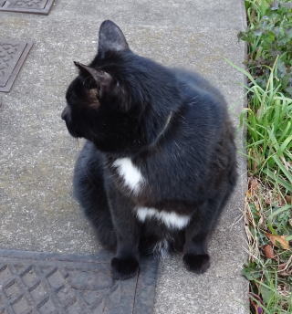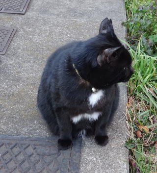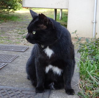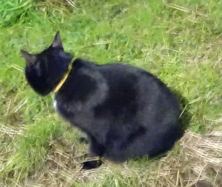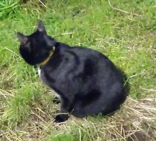 27.九郎ちゃんの胸と腹のエンジェル・マークと言う白毛はタキシードを着ている様に見えます。ブラックタイの代わりの黄色い首輪が長毛になり損ねた中毛に埋もれてしまっています。
