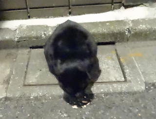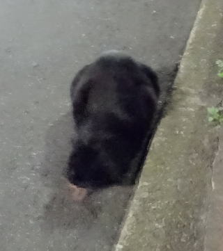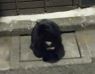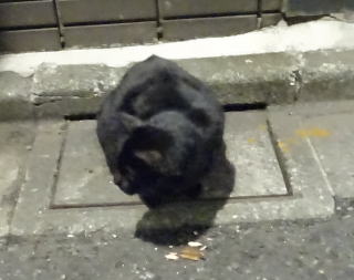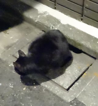 5.タヌキの置物の様に排水溝の上に座ったタヌキちゃん。そこはゴミ集積所です。ゴミ収集日の朝までにそこを移動しないと使い古しのタヌキの置物として回収しれてしまうぞ。