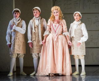 b12.三人の童子はボーイズ・ソプラノです。しかし諸事情でボーイズ・ソプラノが用意出来ない場合は普通の女性のソプラノで代用します。30~40代のオバサンのソプラノが童子の役をしても違和感があります。その場合は天使の羽を付けて「三人の童子」から「三人の天使」に役柄が変化します。大祭司ザラストロから沈黙の試練を受けていた王子タミーノがパミーナちゃんとの会話を無視して、更に大祭司ザラストロから別れを告げる試練を受けると王子タミーノに見捨てられたと思い込み「短剣よ。お前が私の花婿なのね。私の悲しみを終わらせておくれ。愛しい人よ。もうすぐ私達は一緒になれるのよ。私を見捨てるのだから。恋の悩みで傷付くよりこの短剣で死ぬ方が良いの」とパミーナちゃんは短剣を胸に突き刺そうとしています。その時、救いの天使(三人の童子)が現れます。失恋した女の子が思いつめて自殺しようとする演技力が必要です。暇な女性は自宅でパミーナちゃん役の練習を楽しんではどうでしょうか?。演技が良ければ救いの三人の天使が降臨するかもしれません。
