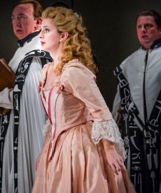b11.第一幕では捕らわれのお姫様を救う救出劇でした。第二幕では大祭司ザラストロから王子タミーノが捕らわれのお姫様のパミーナちゃんと結婚する為の試練と修行を受ける場面に変わります。謎の秘密結社の試練と修行をイメージさせます。第一幕の善の夜の女王と悪魔のザラストロから世俗の悪に染まる夜の女王と高尚な太陽の大祭司ザラストロへと立場が逆転します。これはカトリック教会から悪の秘密結社と批判された謎の秘密結社がカトリック教会など世俗の悪に染まる衆愚の存在で謎の秘密結社こそ神々しい世界に生きている事を現しています。大祭司ザラストロから受けた試練に打勝つ事が出来なかった捕らわれのお姫様のパミーナちゃんは短剣を胸に突き刺し自殺しようとしました。この舞台はアメリカだったのでしょうか?。歌劇を観賞に来てロココ調(18世紀フランス様式)の衣装ではなくアメリカ風の普段着の歌手が出てきたらどう感じますか?。