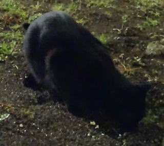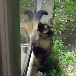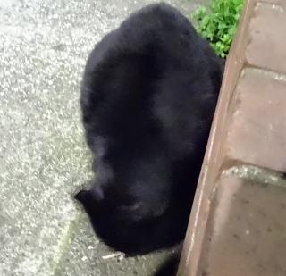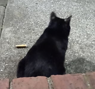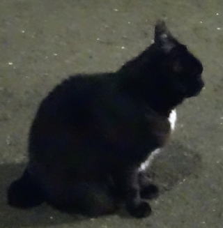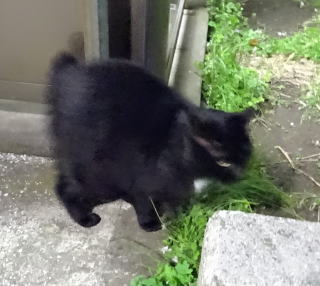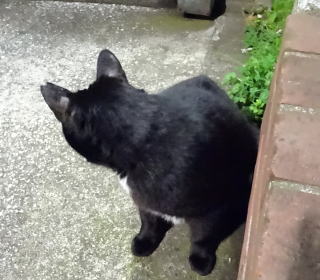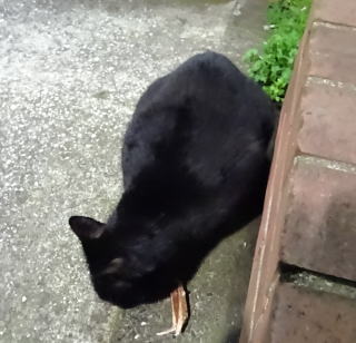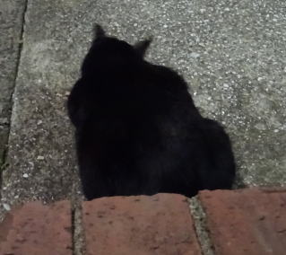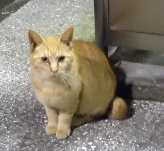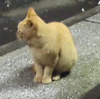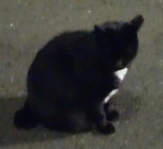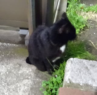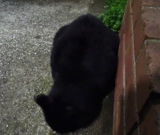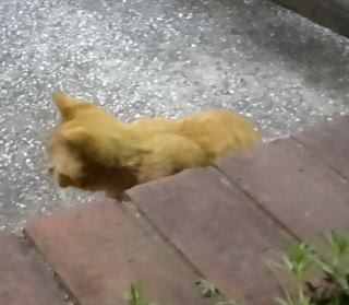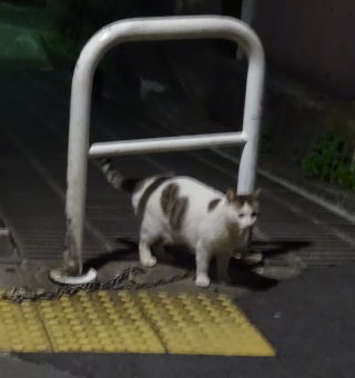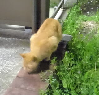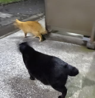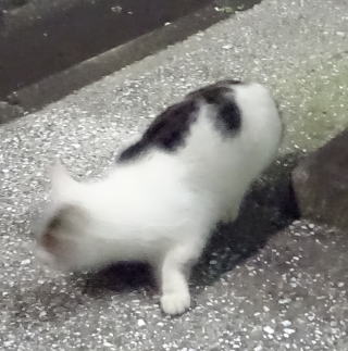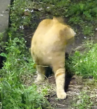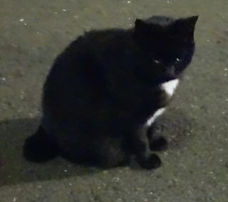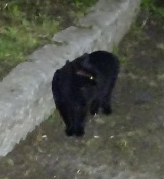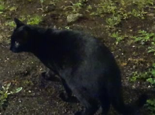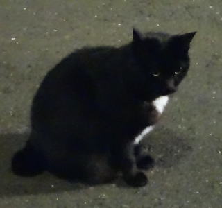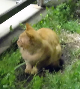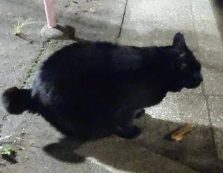 45.この夜もタヌキちゃんの右手から茶虎の息子が登場しました。突然、登場した様に見えますが、10~20m先からタヌキちゃんの足音を聞いて走って来ていたのです。