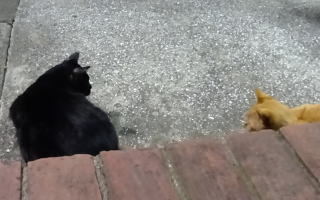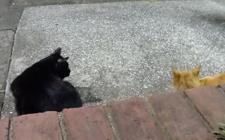 34.桜の花の下で泥棒猫の茶虎の息子がパパに挨拶をしました。するとキャロラインお嬢様がどこからかとなく現れ猛ダッシュして茶虎の息子に襲いかかりました。女性の順位が高く王家に君臨するキャロラインお嬢様がまだ幼い茶虎の息子に躾けをした様と解釈する事も可能ですが、キャロラインお嬢様と茶虎の息子は鼻キッスするほど仲が良いのです。挨拶代わりにケンカ・ゴッコをしたのでしょうか?。画像では見ての通りにキャロラインお嬢様が茶虎の息子の首を甘噛みしています。通常の姉妹ならばネコ・パンチの応酬となりますが、今回は瞬時にキャロラインお嬢様が茶虎の息子の首を噛んで窒息させ様としています。