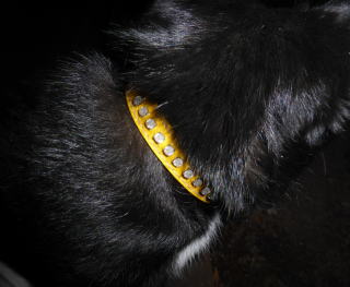 43.鈴は魔除けとしてユダヤ教の祭司が腰に付けていた為、悪霊や悪魔を祓う力があると昔から世界中で信じられています。鈴が付いて宝石(実際は透明なプラスティック)の飾りの付いた黄色い首輪をした九郎ちゃん。