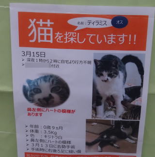 20.キリスト教会の掲示板に一か月以上、この「猫を探しています」が張られています。ティラミスちゃんはその後、どうなったのでしょうか?。一か月を過ぎても見つからないのは…。