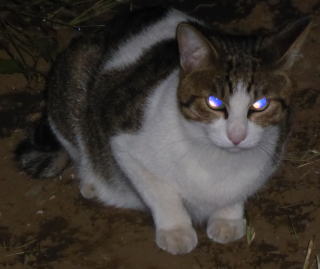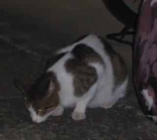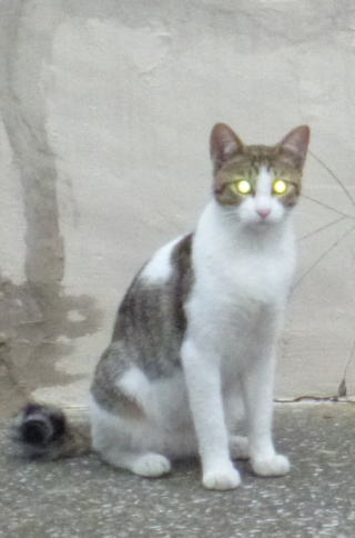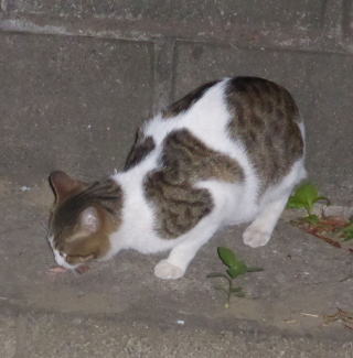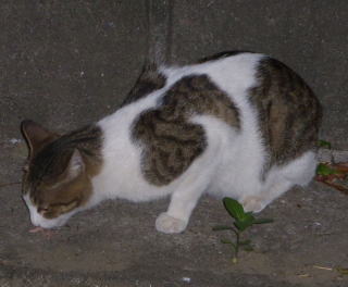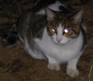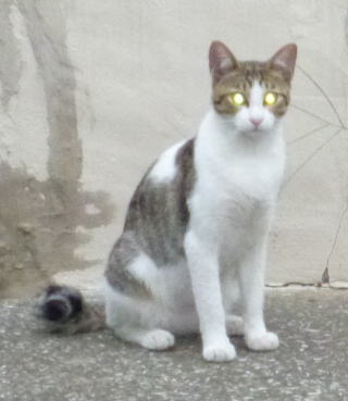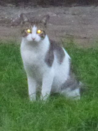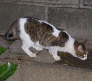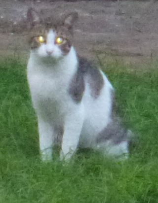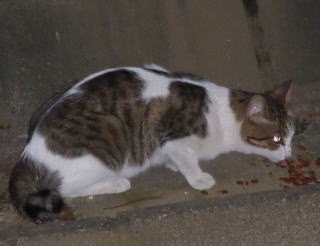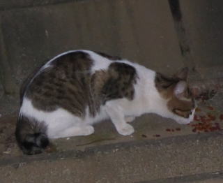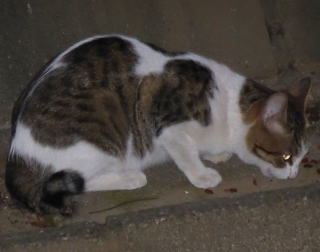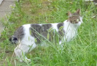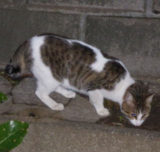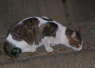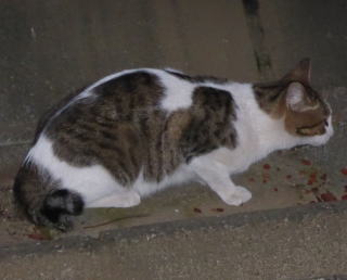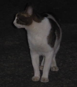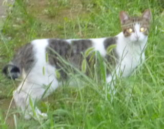外国種の大きな猫。顔が小さいが耳が大きく手足や胴体が長い。日本猫とは体形が異なる。毛柄はサバ虎白。アビシニアンは単色系が多いのにサバ虎白とは混血してしまったのか?尾も関東地方に多い尾曲りだから純血なアビシニアンではなく日本猫も少し混血しているのかもしれない。子猫の時は胴体が短く手足だけが長く変だったけど成猫になって美人になった。頭が良く学習能力が高い。ただ「グェエー」と野獣の様な鳴き声がマイナス。子猫の時からフーちゃんのご飯を横取りして大きくなったね。大事な愛娘。