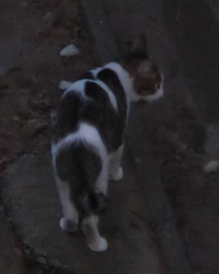 1.「パパ行ってらっしゃい」。手足が長い。日本猫の倍はありそうな..人間ならスマートな長身のモデル体形だと思う。ただサバ虎白の毛柄と尾曲りに注目。