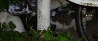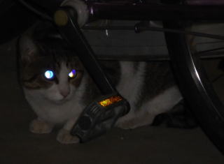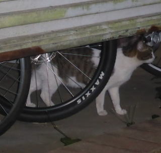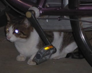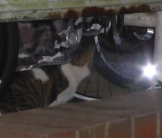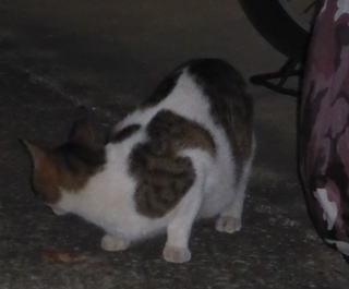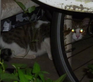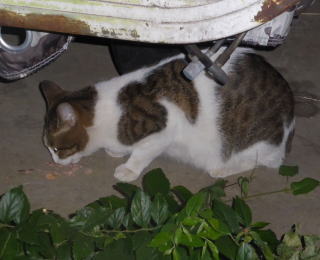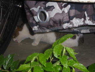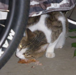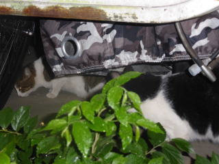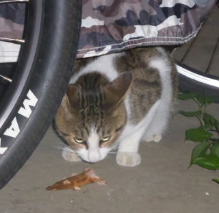 33.いつもはフーちゃんのいるバイク・カバーに半身を隠して焼き鰹を食べるメグちゃん。