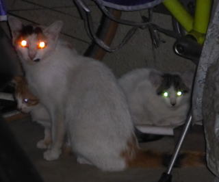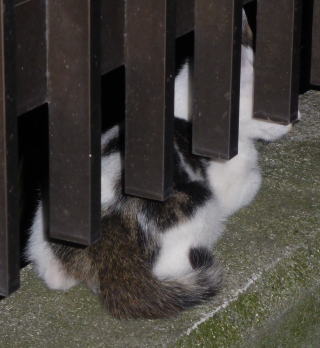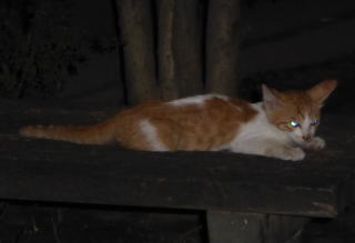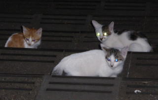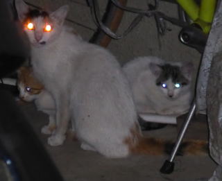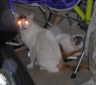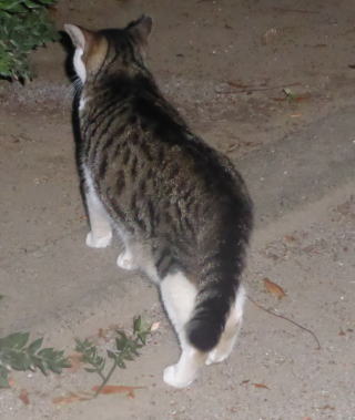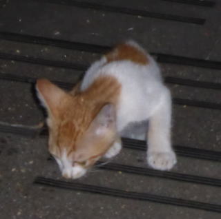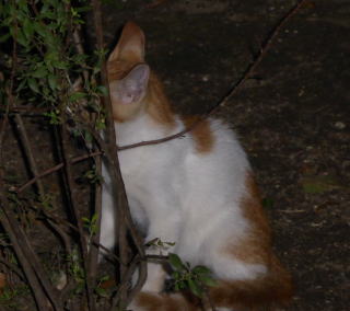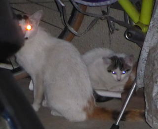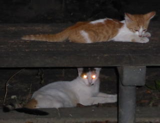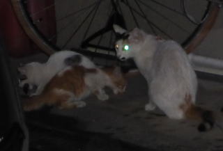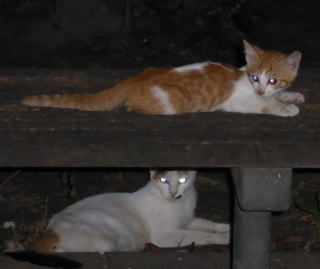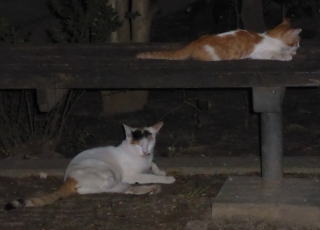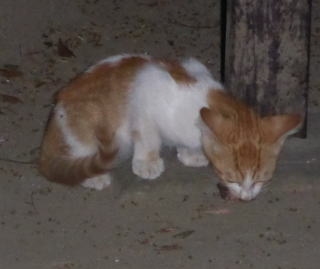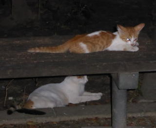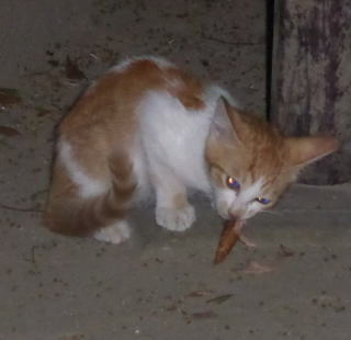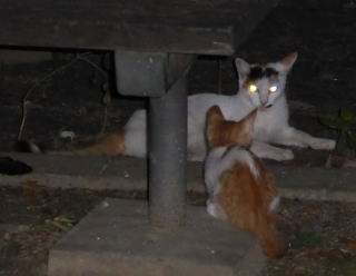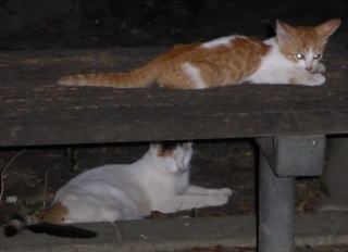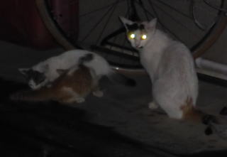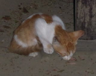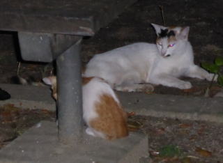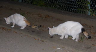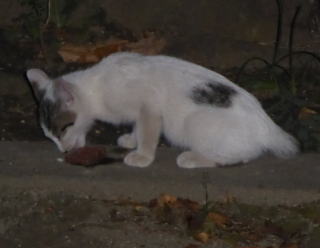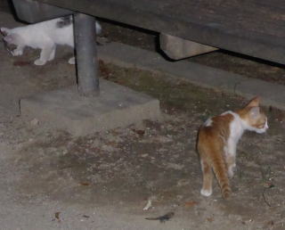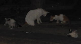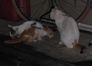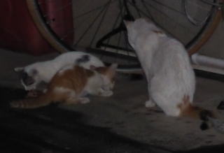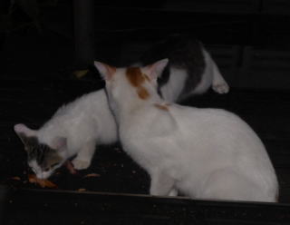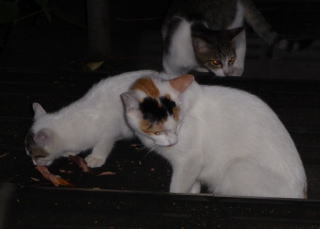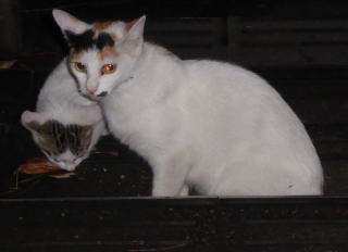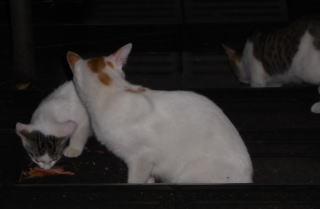 6.リボンちゃん。子猫に焼き鰹を与える。バンの白猫のイタチのような体形はリボンちゃんにソックリだ。茶虎猫の方は小さな顔、大きな耳、手足尾が長い南方系の猫って感じだ。