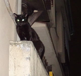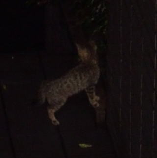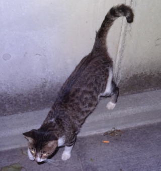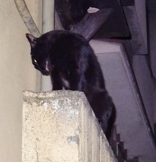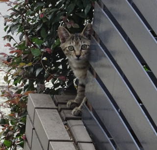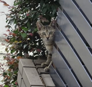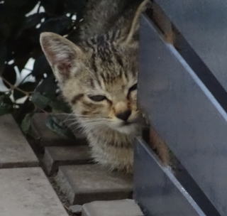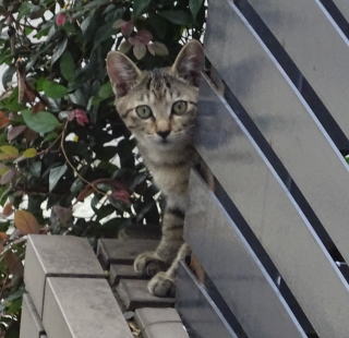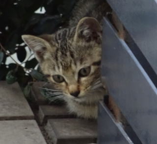 9.素早く逃げて物陰に隠れる子猫。パパにアイ・コンタクトをして挨拶をしています。家猫が野良になった場合はパパが飼う権利があるかないか不明です。しかしこの子猫はパパの自宅の敷地内で産まれた100%の野良です。捕まえてパパが室内で飼っても誰も文句を言う人はいないでしょう。