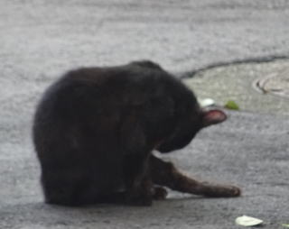 43.隣に毛繕いをしている耳の裏がハゲたタヌキもどきの黒猫がいました。この二匹は双子の兄弟です。この子を(仮名)黒タヌキもどきBちゃんとします。ハゲ・タヌキちゃんが毛繕いしている処にソックリです。