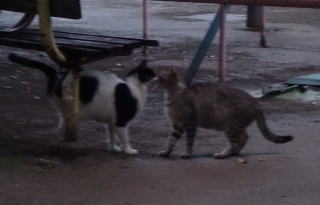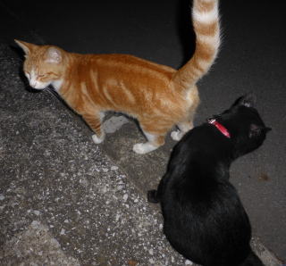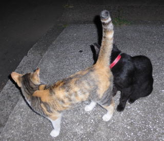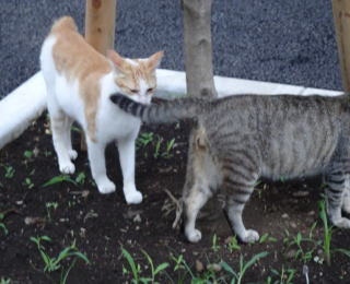 この画像は九郎ちゃん36の45です。成猫すると雌猫は雄猫に尾の匂いを嗅がせます。ドンナ(貴族の娘・貴婦人)アンナちゃんはまだ女子高生(JK)だったんだ。