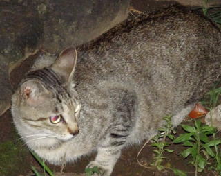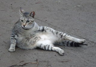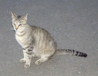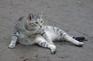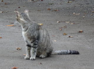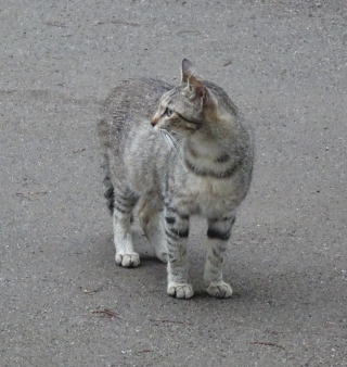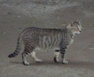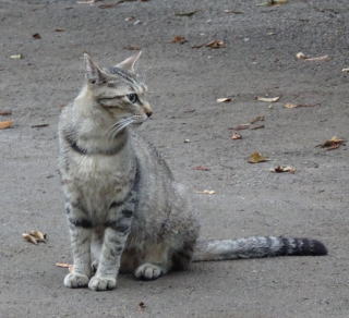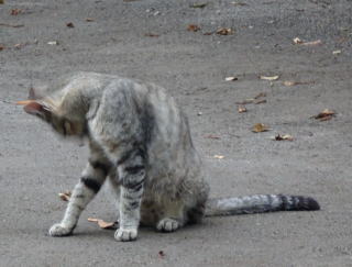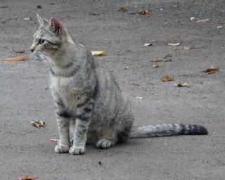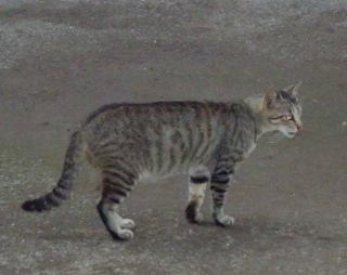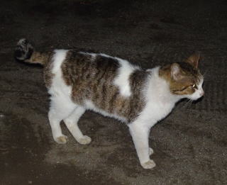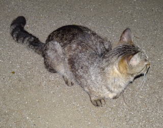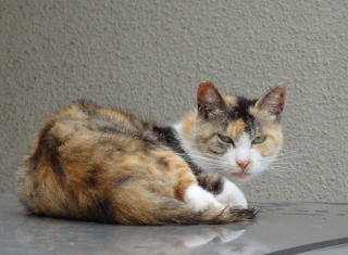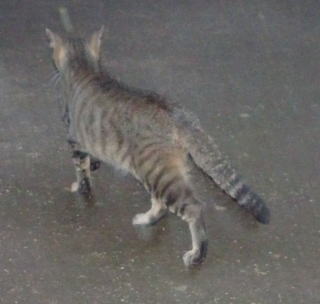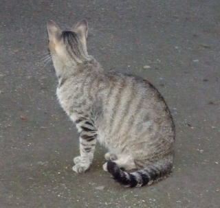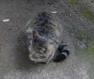 30.三毛珍獣ちゃんの年の離れた妹のクラシック・タビー柄の一歳の三毛の子猫。三毛珍獣ちゃんと一緒で獣医から避妊手術を受けたのでしょうか?。右耳が切断されています。三毛珍獣ちゃんと同じく腹部に数cmの傷があるのでしょうか?。