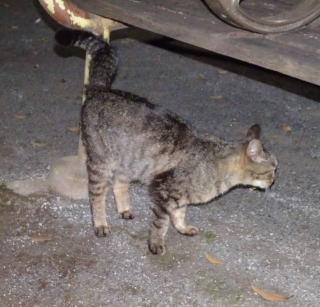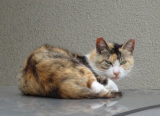 31.プチ豪邸の自動車の上で寛ぐクラシック・タビー柄の一歳の三毛の子猫。プチ豪邸の主人が獣医に避妊手術を受けさせたのであればパパは何と言ったら良いのでしょうか?。飼い猫にとって最大の脅威を与える者は飼い主なのかもしれない。