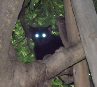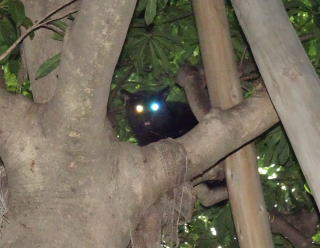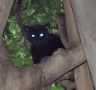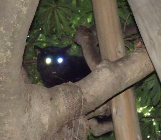 この画像は九郎ちゃん72の8です。真から狂暴な雄の黒猫や猛烈な雄の黒猫が地上をうろついていた時は細い枝の上で頭を下にして凶悪な犯罪者を警戒していた木上登子(きのうえたかこ)ちゃんですが、現在は状況が違う様です。